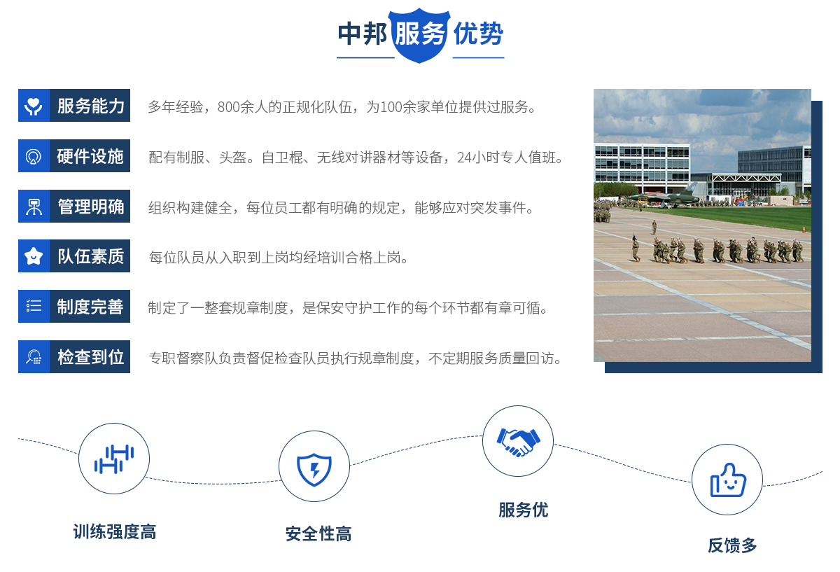 中邦服務(wù)簡(jiǎn)介 安徽中邦保安服務(wù)有限公司總公司成立于2019年。公司 成立以來,始終以“文明值勤、優(yōu)良服務(wù)、客戶至上、安全為先” 為宗旨,以保一方平安為已任,面向社會(huì)各界等提供有償保安護(hù) 衛(wèi)、技術(shù)防范、保安培訓(xùn),是一家專業(yè)化保安服務(wù)公司。目前, 公司下為200多家客戶單位提供周到安全的保安服務(wù),遍布全省 及周邊地區(qū),現(xiàn)有各類專業(yè)人員和保安員2000余名。 中邦服務(wù)宗旨 安徽中邦保安服務(wù)有限公司是為適...